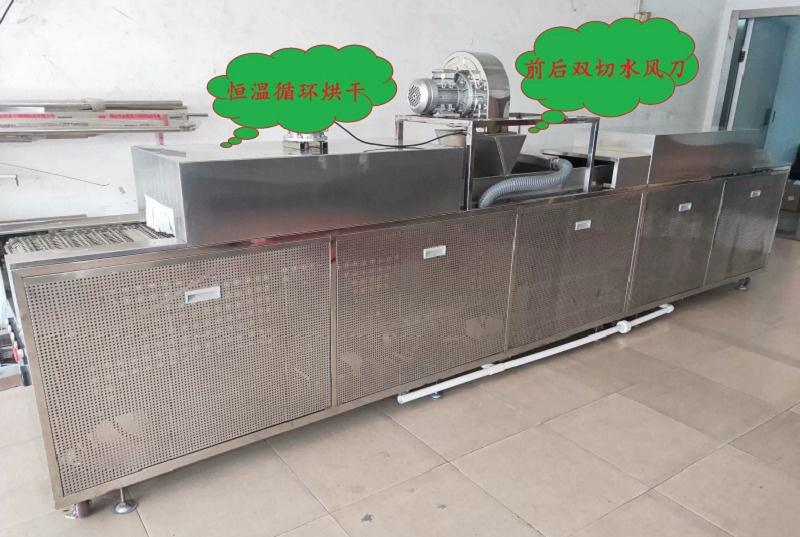 該機采用全不銹鋼制作,由高溫清洗區(對過通的產品進行上、下、沖洗,去除表面油,雜物分解)、漂洗區(由前方初洗分解后進行精洗)、過濾、風刀切水(由前方清洗的水份進行攔截)、烘干(利用輸送帶方向與吹風向相向動作原理,高溫干掉表面的水份)、全自動系統傳送和電器系統等器件組成。通過自動傳送系統,履帶式輸送清洗區,達到清洗效果,經過系統清洗、烘干的由出料口處從網帶上帶出;電氣控制采用人性化對清洗全程實施自動控制,使清洗過程保持在正常狀態下工作,并對水循環、過濾、底水位等進行自動化控制,設有液位開關、出囗限位、應急開關等控制元氣件,有力地保證了設備的正常動轉。